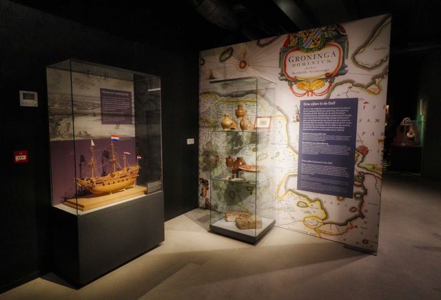 Het hunebed is het eerste dat opvalt binnen de archeologie-zaal. Het is het meest noordelijke hunebed van Nederland en gevonden in de buurt van Delfzijl. In de vitrinewanden eromheen wordt meer verteld over het leven in die tijd. En achter het hunebed zie je een landschap op een groot scherm: zo kan het er in de tijd van de hunebedbouwers uitgezien hebben. Er zijn vondsten te zien uit de Romeinse tijd, maar ook uit de late middeleeuwen, zoals schoenen: die zijn na eeuwen in de grond gezeten te hebben nog steeds goed herkenbaar.