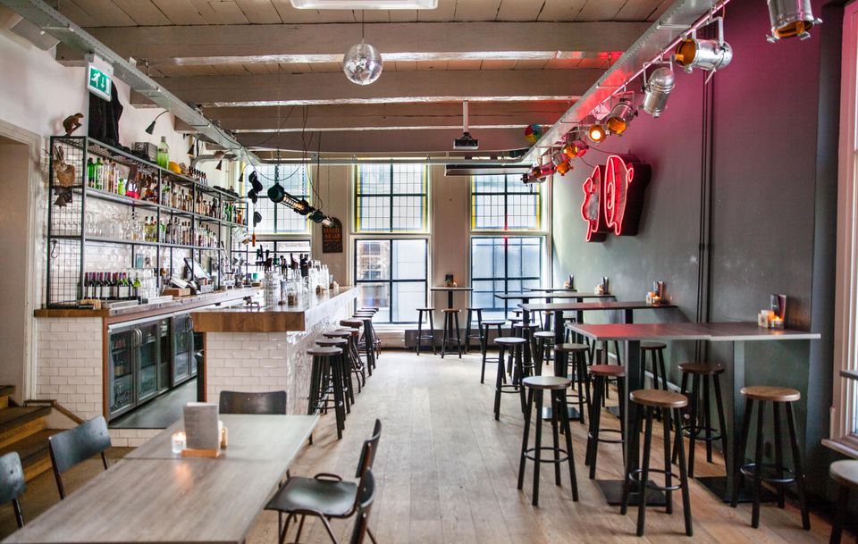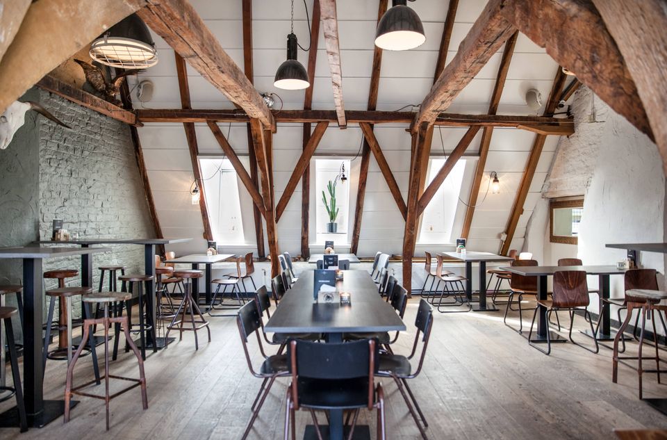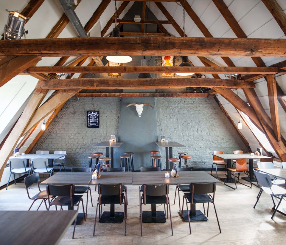 Links is het Café met binnentuin waar we ’s zomers de braai aansteken. Boven is de Pub met keuken waar je goed kunt eten en gezellig kunt borrelen. Dankzij de vele verschillende ruimtes in het pand kunnen we groepen verschillende mogelijkheden bieden.